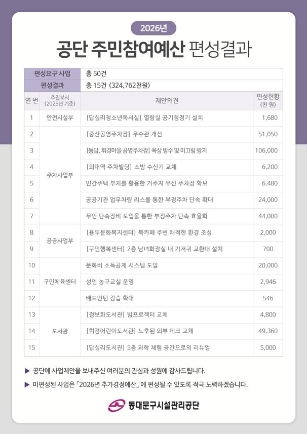 공지 전체 2026년 공단 주민참여예산 편성결과 작성자 : 동대문관리자 조회 : 281 등록일시 : 2026년 1월 15일 14시 6분 9초 2026년 공단 주민참여예산 편성결과.jpg [ Size : 71.87KB, Down : 298 ] 미리보기 다운로드 목록보기