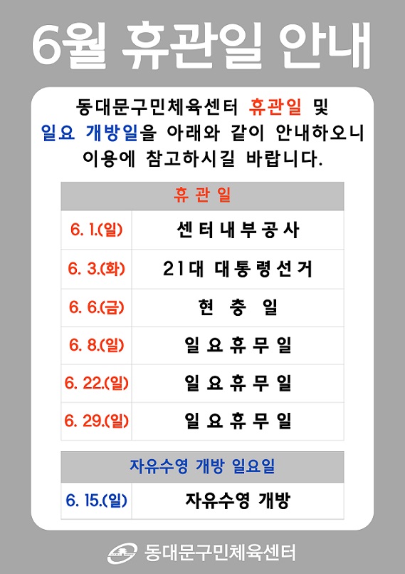 공지 동대문구민체육센터 6월 휴관일 안내(재공지) 작성자 : 동대문관리자 조회 : 735 등록일시 : 2025년 5월 22일 19시 20분 35초 6월 휴관일 안내.jpg [ Size : 103.08KB, Down : 596 ] 미리보기 다운로드 목록보기