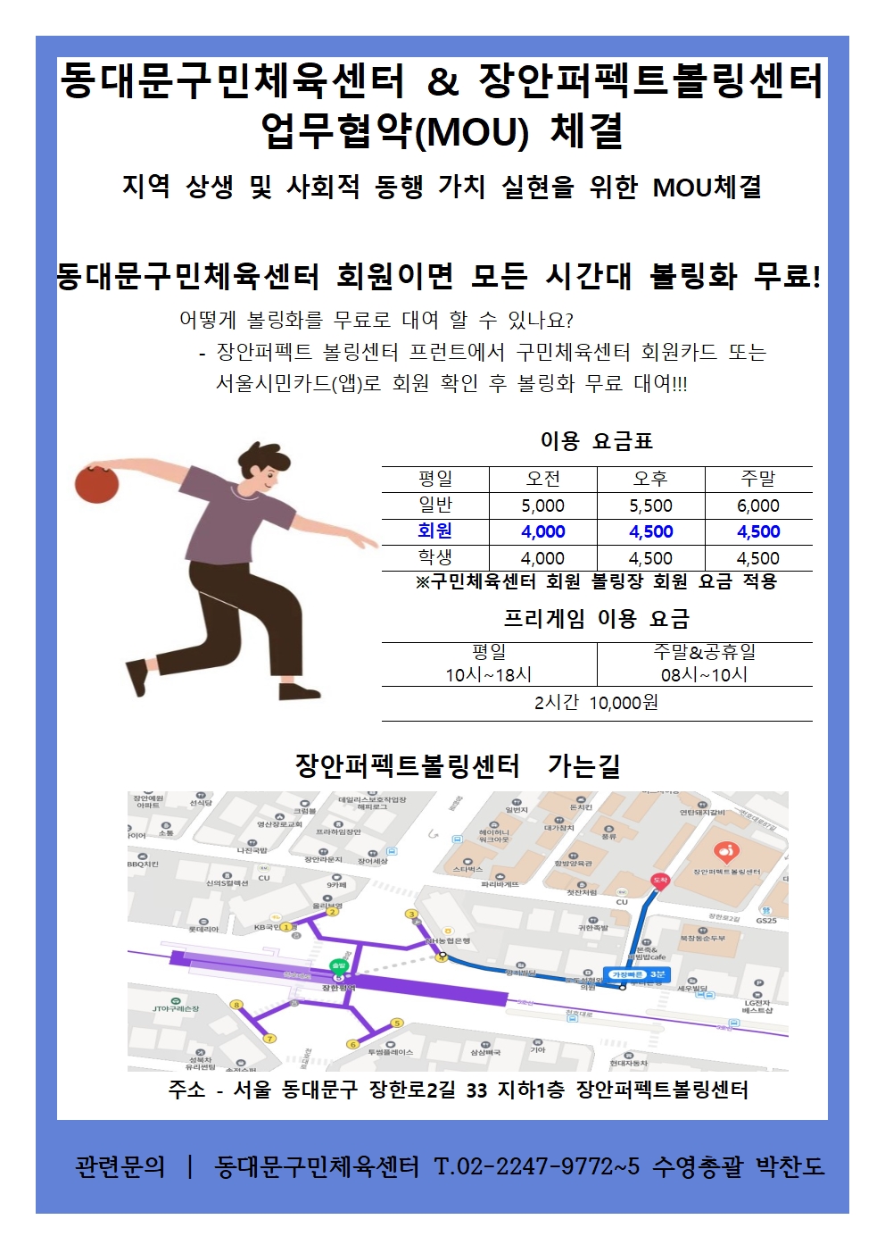 공지 동대문구민체육센터 동대문구민체육센터&장안퍼펙트볼링센터 업무협약(MOU) 체결 작성자 : 동대문관리자 조회 : 509 등록일시 : 2024년 11월 12일 10시 30분 30초 볼링장 업무협약 홍보물001.jpg [ Size : 580.92KB, Down : 388 ] 미리보기 다운로드 목록보기