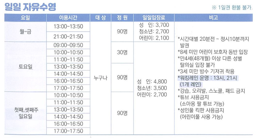 공지 동대문구민체육센터 동대문구민체육센터 일일 자유수영 시간 안내 작성자 : 동대문관리자 조회 : 1,688 등록일시 : 2025년 4월 21일 16시 34분 54초 일일자유수영.JPG [ Size : 89.17KB, Down : 2,130 ] 미리보기 다운로드 목록보기