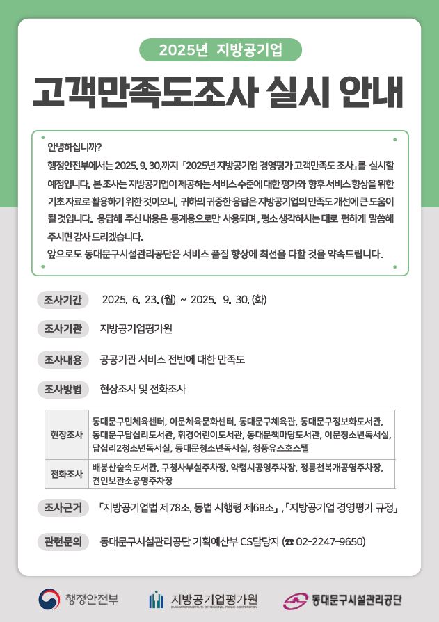 공지 전체 동대문구시설관리공단 2025년 고객만족도 조사 실시 안내 작성자 : 동대문관리자 조회 : 205 등록일시 : 2025년 6월 26일 10시 12분 19초 동대문구시설관리공단 2025년 지방공기업 고객만족도 조사 실시 안내.JPG [ Size : 95.85KB, Down : 134 ] 미리보기 다운로드 목록보기
