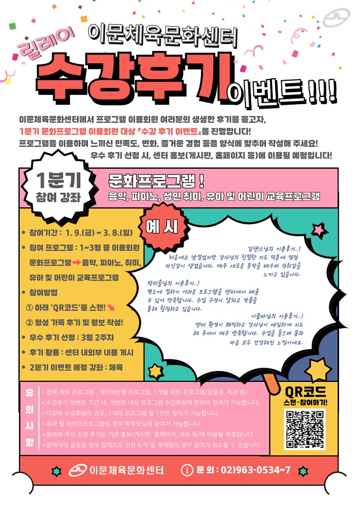 공지 이문체육문화센터 [이문체육문화센터] 체육 문화 프로그램 릴레이 수강후기 이벤트 - 1분기 안내 작성자 : 동대문관리자 조회 : 174 등록일시 : 2026년 1월 13일 10시 17분 44초 수강후기-이벤트(웹).jpg [ Size : 274.57KB, Down : 179 ] 미리보기 다운로드 목록보기