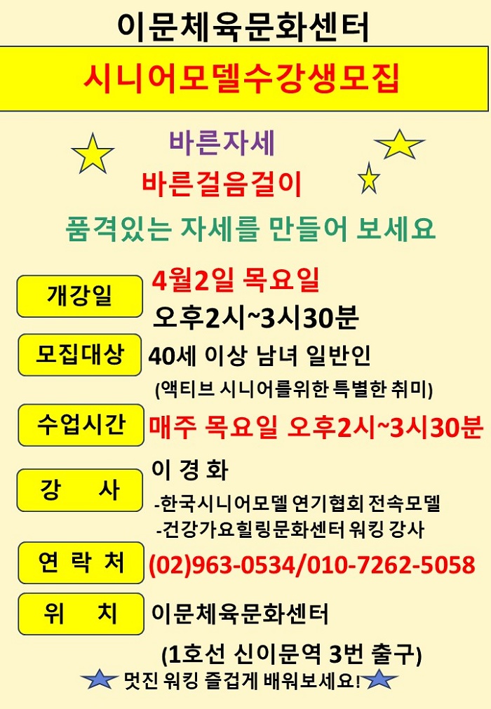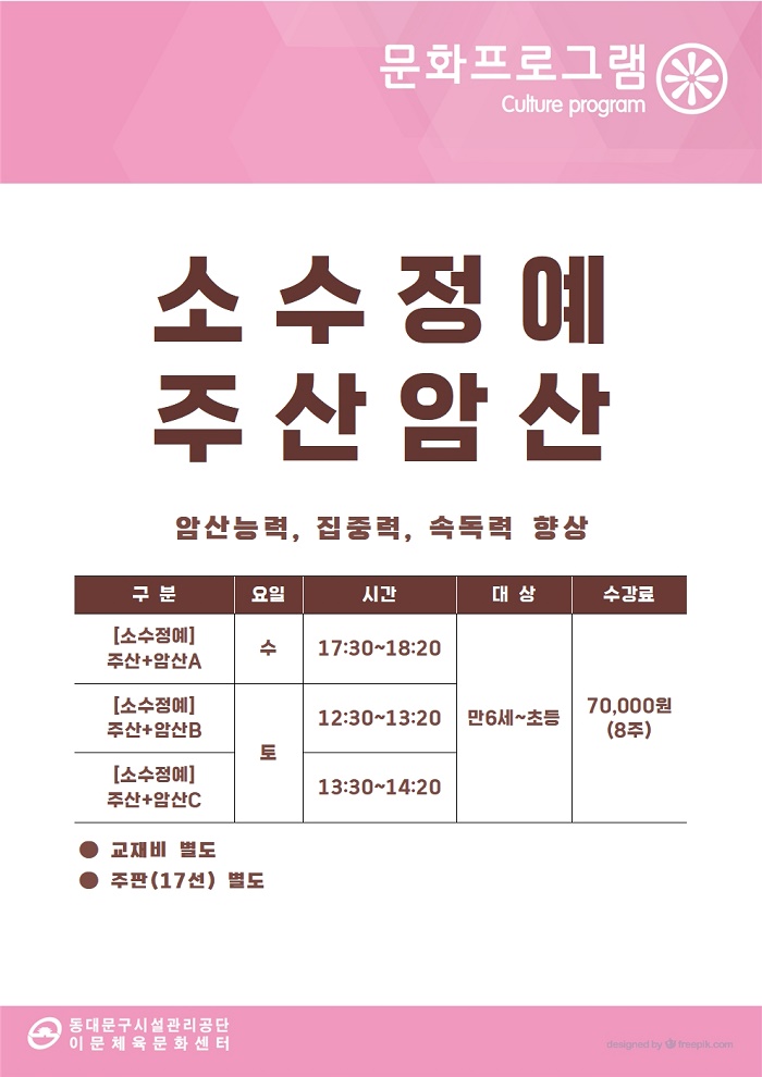 공지 이문체육문화센터 4월 봄학기 추가 개설 프로그램 안내! 작성자 : 동대문관리자 조회 : 311 등록일시 : 2026년 3월 11일 9시 30분 6초 주산암산.jpg [ Size : 109.69KB, Down : 360 ] 미리보기 다운로드 2026 시니어모델 홍보물.jpg [ Size : 224.83KB, Down : 328 ] 미리보기 다운로드 ● 주산암산 토요 1개반 추가 운영 예정입니다! 목록보기