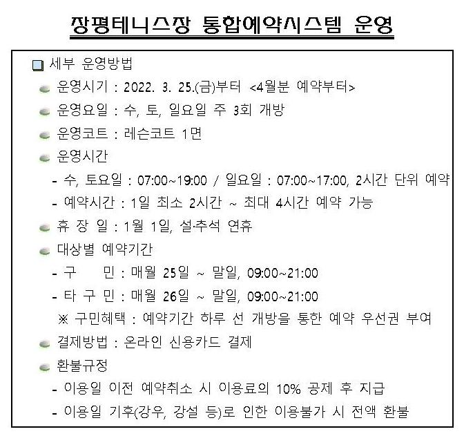 동대문구민체육센터 장평테니스장 통합예약사이트 운영 안내 작성자 : 동대문관리자 조회 : 868 등록일시 : 2022년 3월 25일 10시 41분 15초 장평테니스장 통합예약시스템 운영.jpg [ Size : 76.07KB, Down : 777 ] 미리보기 다운로드 목록보기