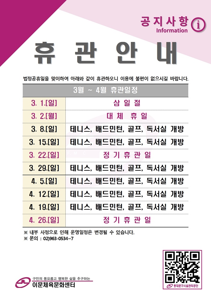 공지 이문체육문화센터 [이문체육문화센터] 2026년 3~4월 휴관일 안내 작성자 : 동대문관리자 조회 : 31 등록일시 : 2026년 2월 23일 11시 38분 20초 34.jpg [ Size : 196.18KB, Down : 32 ] 미리보기 다운로드 목록보기