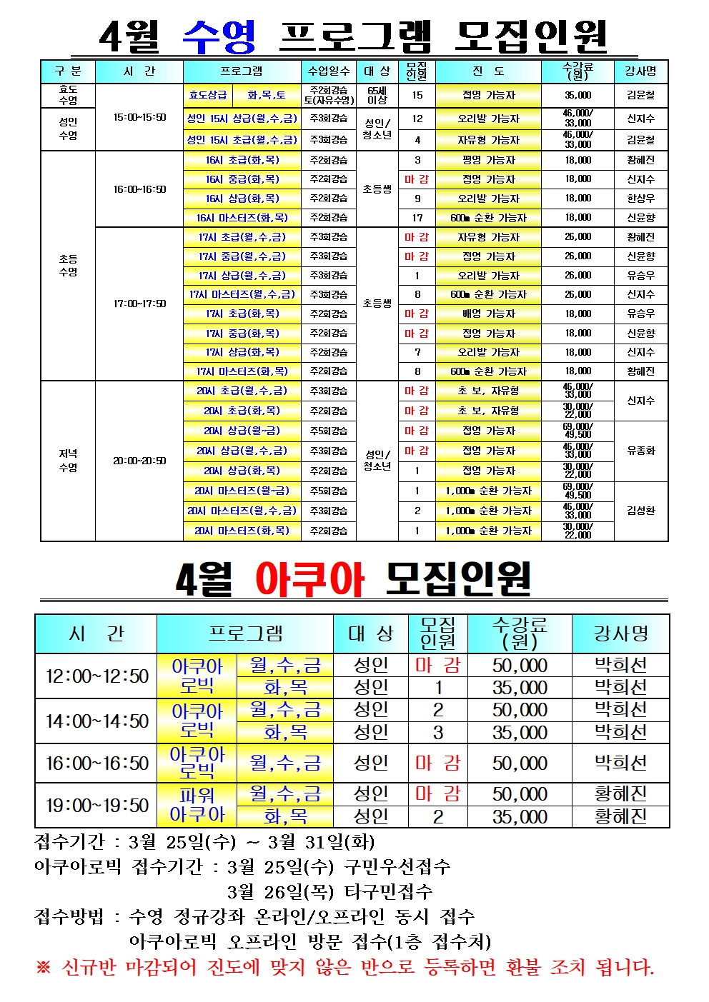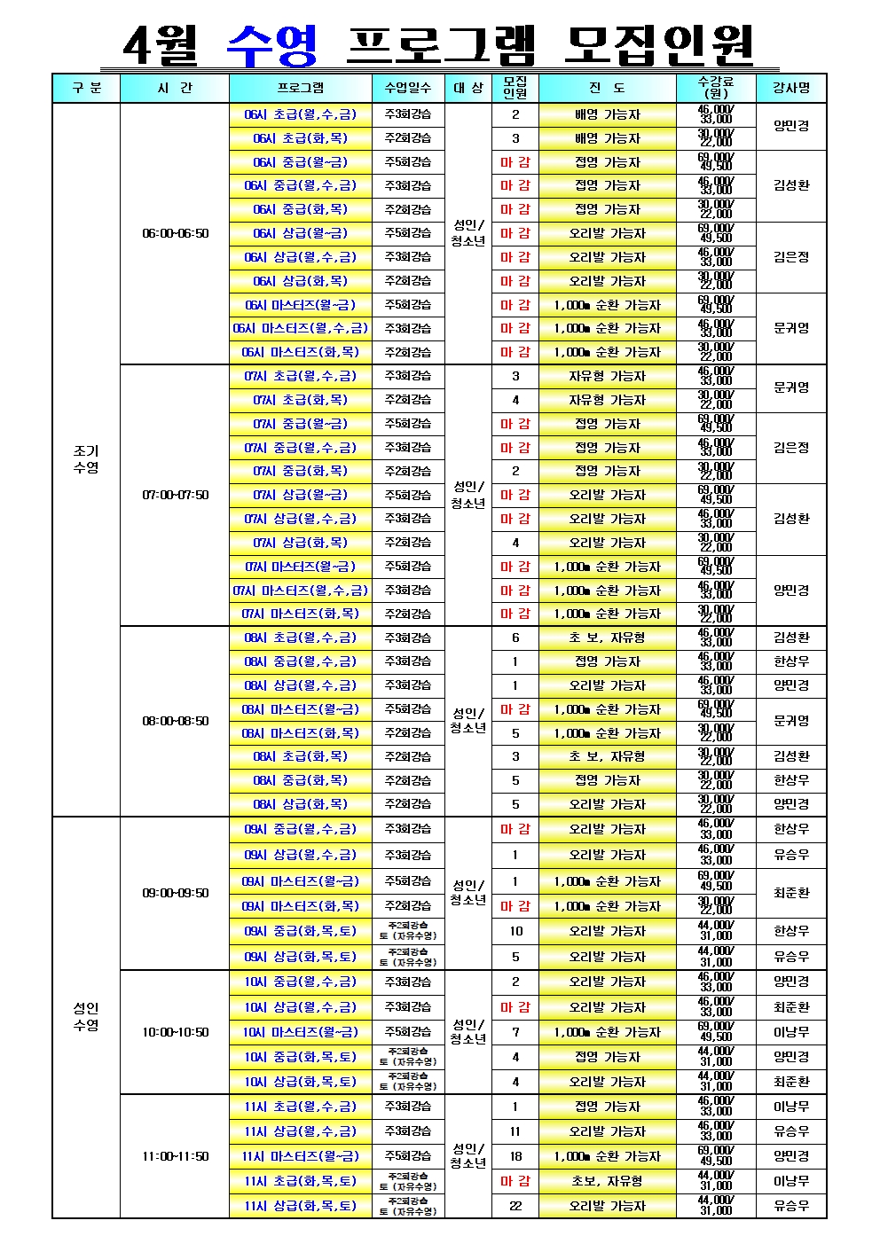 공지 동대문구민체육센터 2026년 4월 수영 신규모집 잔여인원 작성자 : 동대문관리자 조회 : 287 등록일시 : 2026년 3월 23일 20시 9분 31초 2026년 4월 모집인원현황(수영)001.jpg [ Size : 913.34KB, Down : 507 ] 미리보기 다운로드 2026년 4월 모집인원현황(수영)002.jpg [ Size : 875.81KB, Down : 479 ] 미리보기 다운로드 목록보기