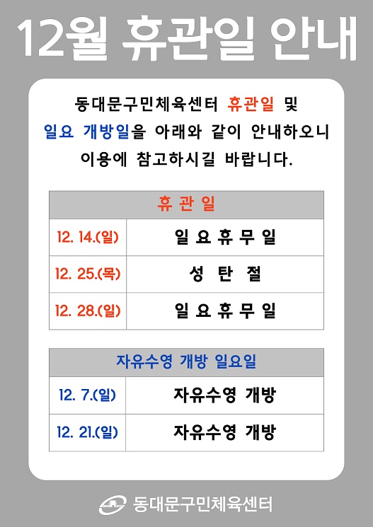 공지 동대문구민체육센터 12월 휴관일 안내 작성자 : 동대문관리자 조회 : 326 등록일시 : 2025년 11월 26일 18시 39분 14초 12월 휴관일 안내.jpg [ Size : 84.48KB, Down : 353 ] 미리보기 다운로드 목록보기