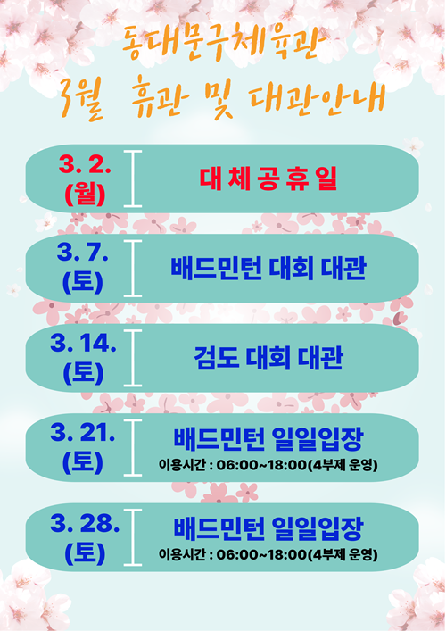 공지 동대문구체육관 3월 휴관 및 대관 안내 작성자 : 동대문관리자 조회 : 192 등록일시 : 2026년 3월 11일 14시 55분 39초 KakaoTalk_20260311_085802146.png [ Size : 237.6KB, Down : 223 ] 미리보기 다운로드 목록보기