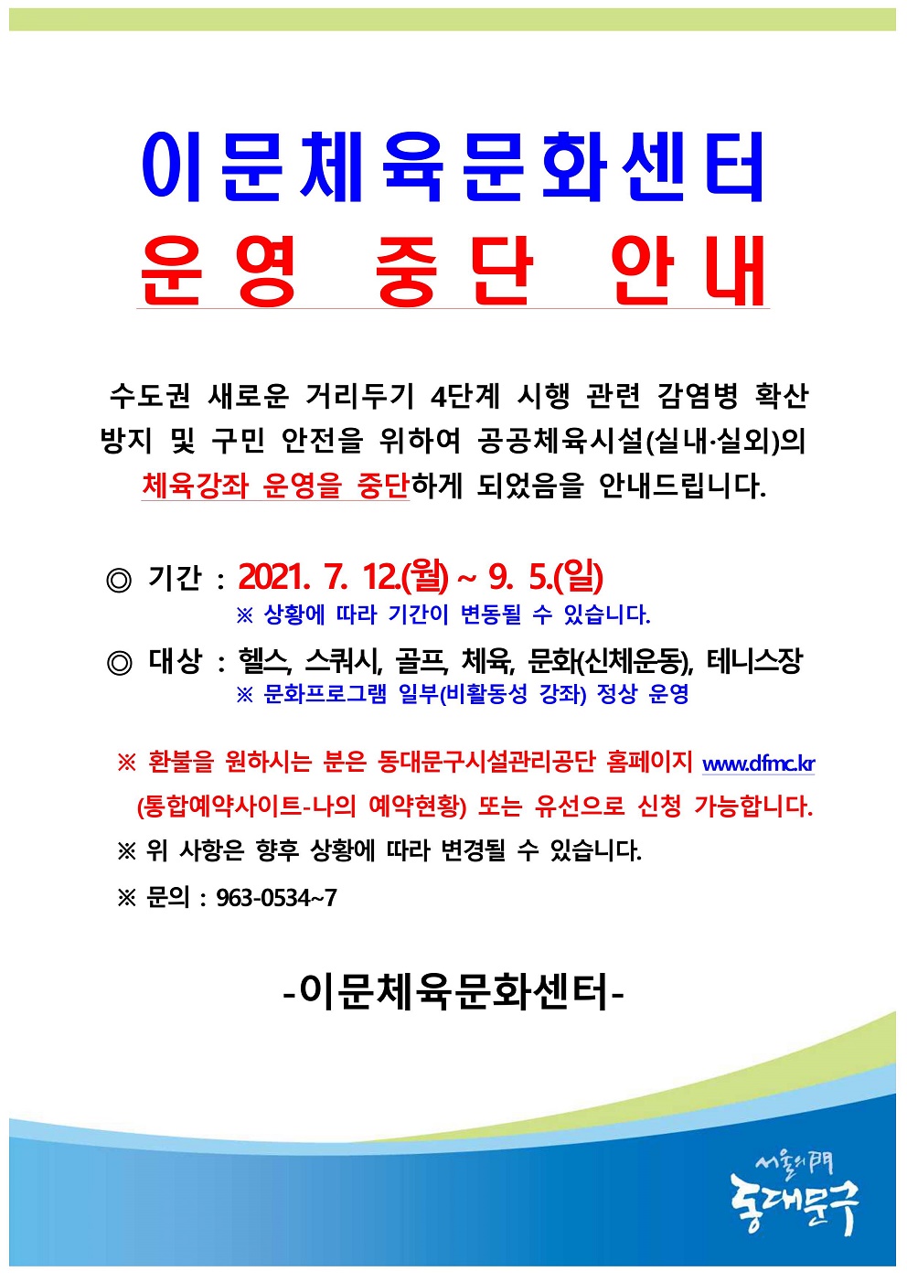 이문체육문화센터 [이문체육문화센터] 운영 중단 안내(7/12 ~ 9/5) 작성자 : 동대문관리자 조회 : 734 등록일시 : 2021년 7월 12일 14시 40분 1초 0001.jpg [ Size : 290.52KB, Down : 566 ] 미리보기 다운로드 목록보기
