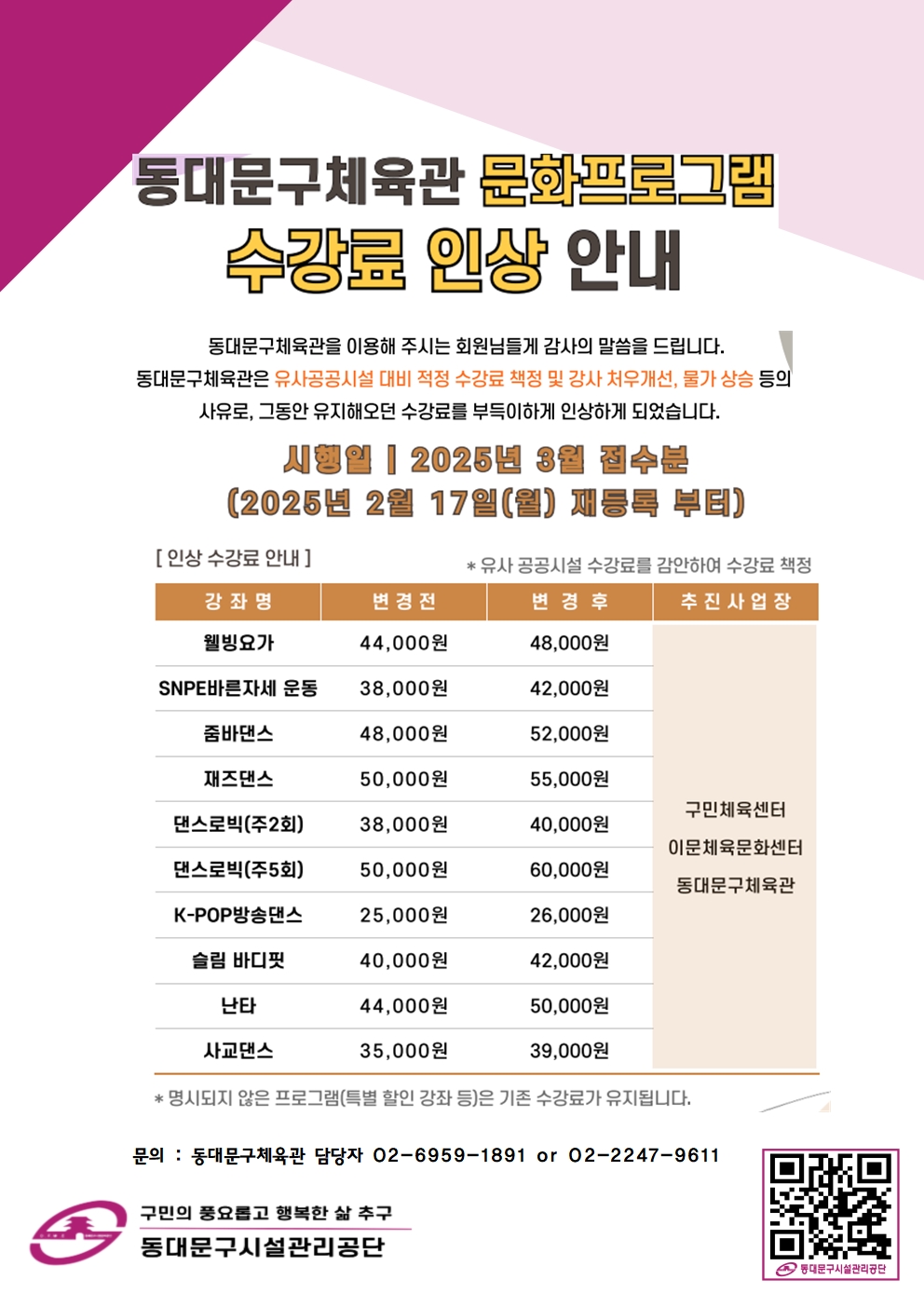 2025년 동대문구체육관 문화프로그램 수강료 인상 안내(공식게시판용)001.jpg   [ Size : 425.88KB, Down : 667 ] 미리보기 다운로드