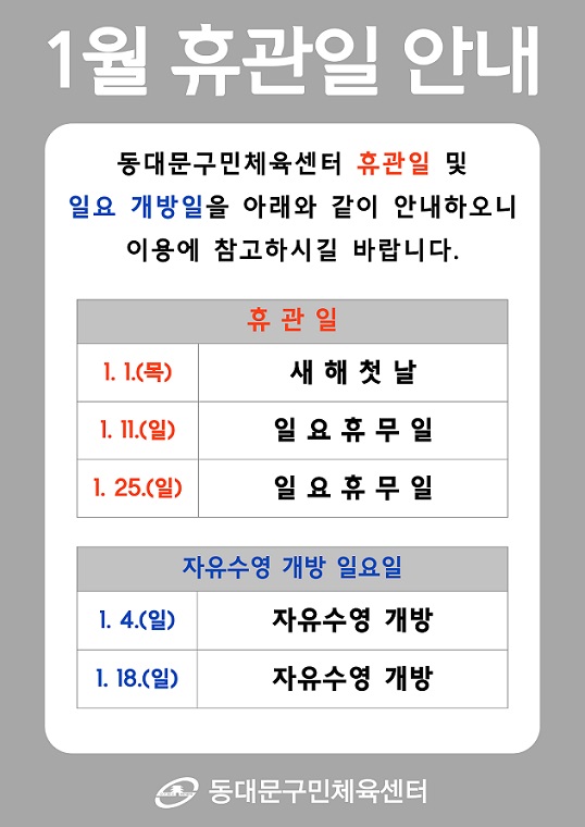 공지 동대문구민체육센터 1월 휴관일 안내 작성자 : 동대문관리자 조회 : 311 등록일시 : 2025년 12월 23일 14시 17분 18초 1월 휴관일 안내.jpg [ Size : 84.35KB, Down : 339 ] 미리보기 다운로드 목록보기