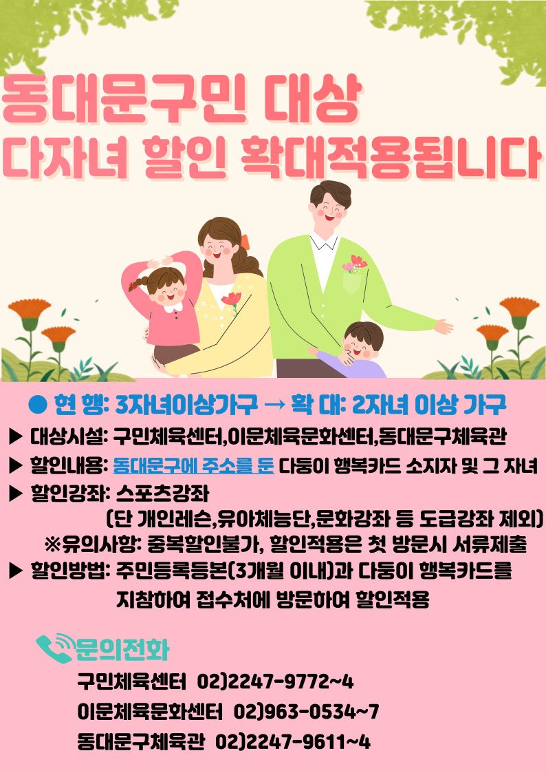 공지 전체 다자녀 할인 확대 적용 안내 작성자 : 동대문관리자 조회 : 794 등록일시 : 2023년 11월 14일 17시 30분 2초 다자녀 할인 확대적용 안내.jpg [ Size : 272.99KB, Down : 835 ] 미리보기 다운로드 목록보기