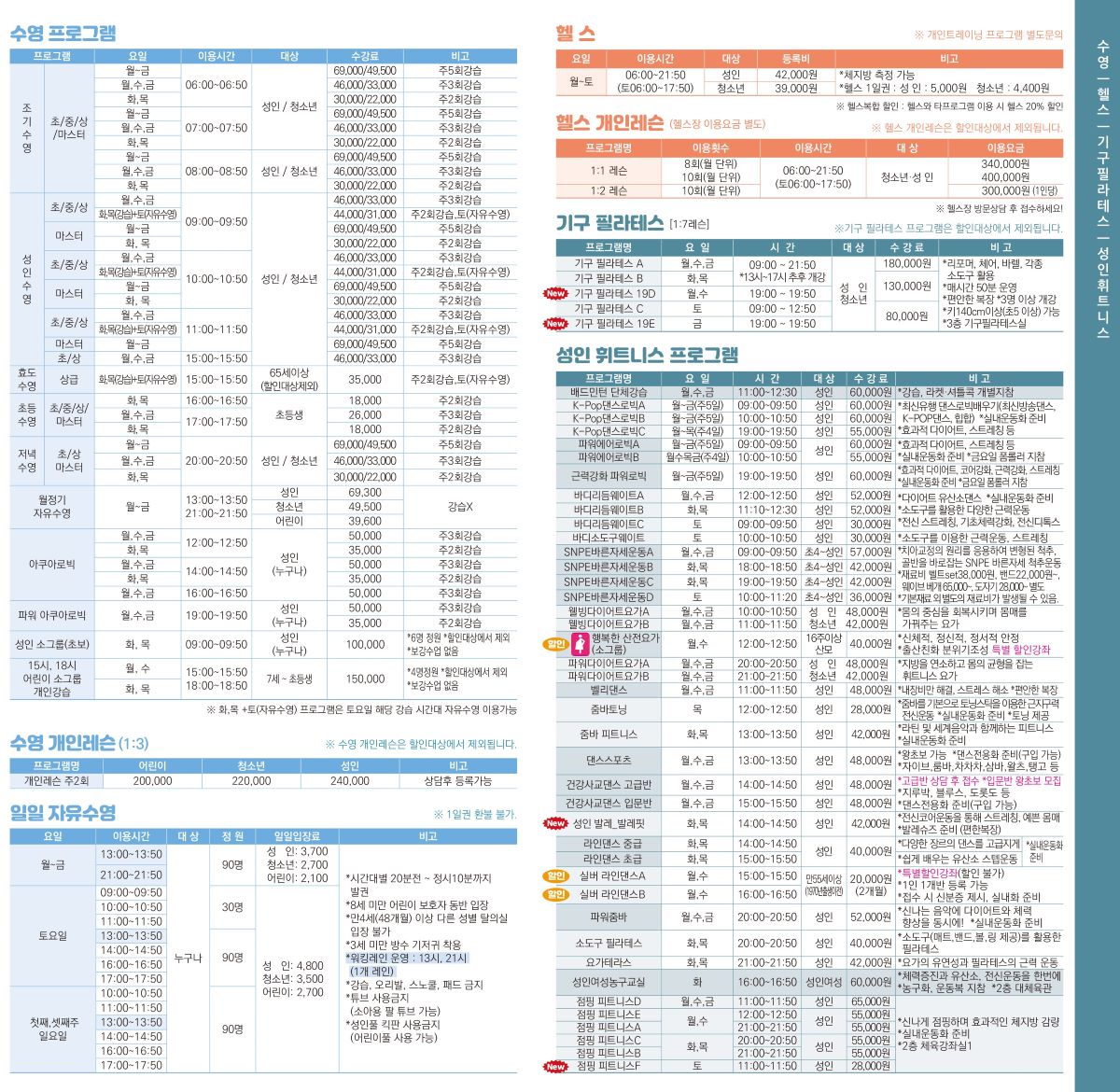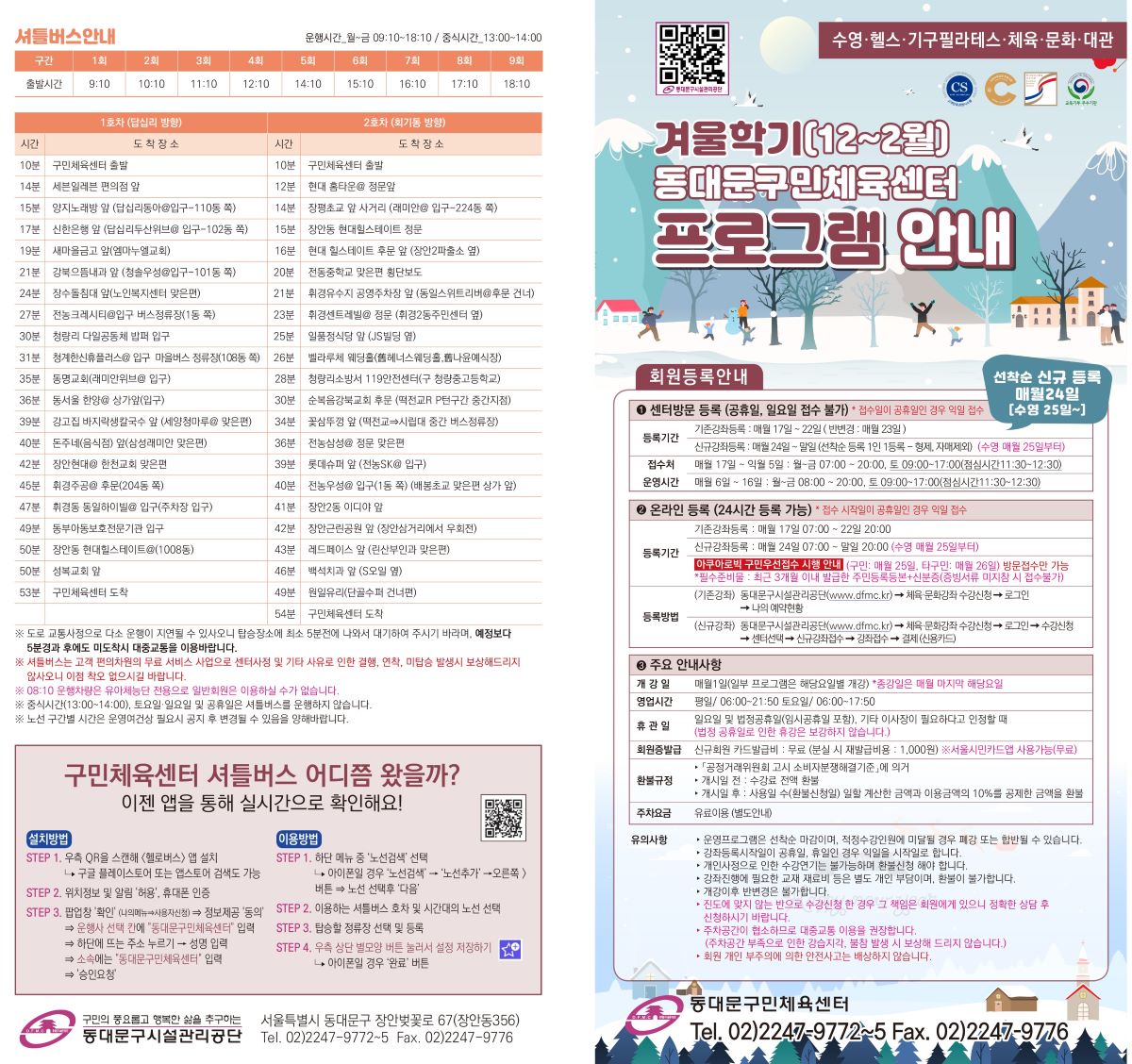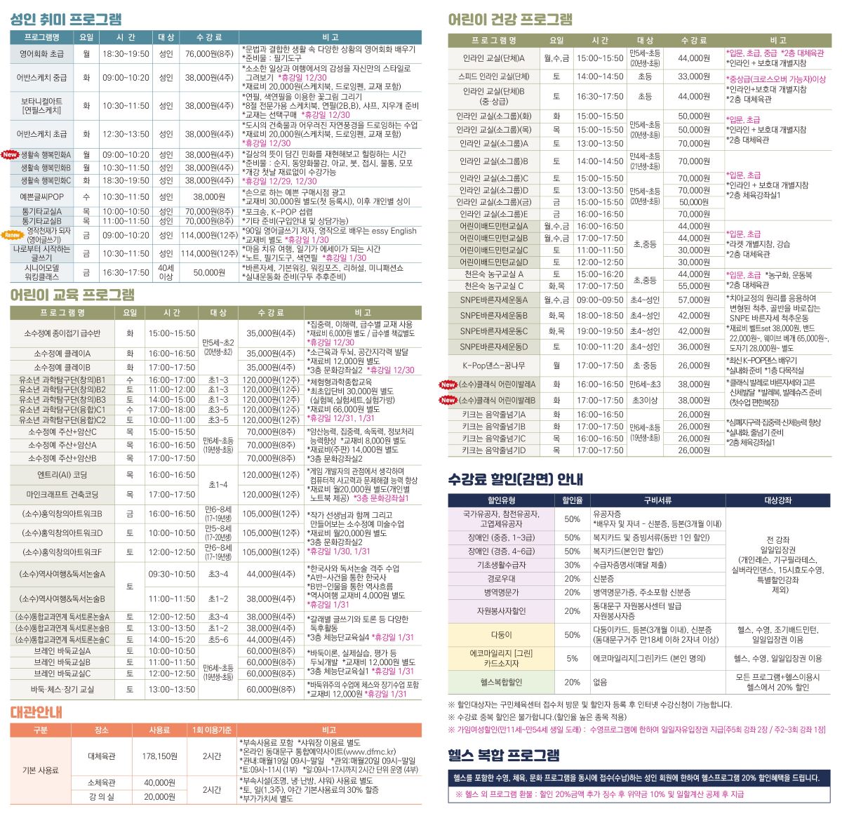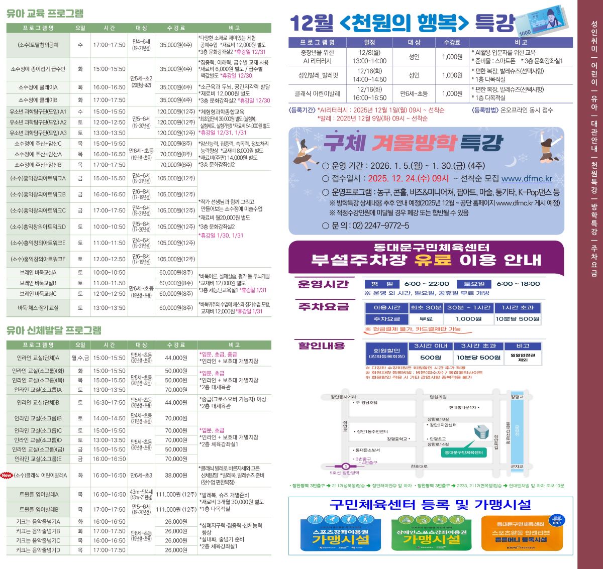 공지 동대문구민체육센터 2025년 겨울학기 (12월~2월) 프로그램 안내 작성자 : 동대문관리자 조회 : 756 등록일시 : 2025년 11월 13일 16시 42분 32초 2025겨울전단사각1_1200.jpg [ Size : 322.55KB, Down : 1,169 ] 미리보기 다운로드 2025겨울전단사각2_1200.jpg [ Size : 352.81KB, Down : 1,153 ] 미리보기 다운로드 2025겨울전단사각3_1200.jpg [ Size : 369.63KB, Down : 1,141 ] 미리보기 다운로드 2025겨울전단사각4_1200.jpg [ Size : 300.35KB, Down : 1,118 ] 미리보기 다운로드 목록보기