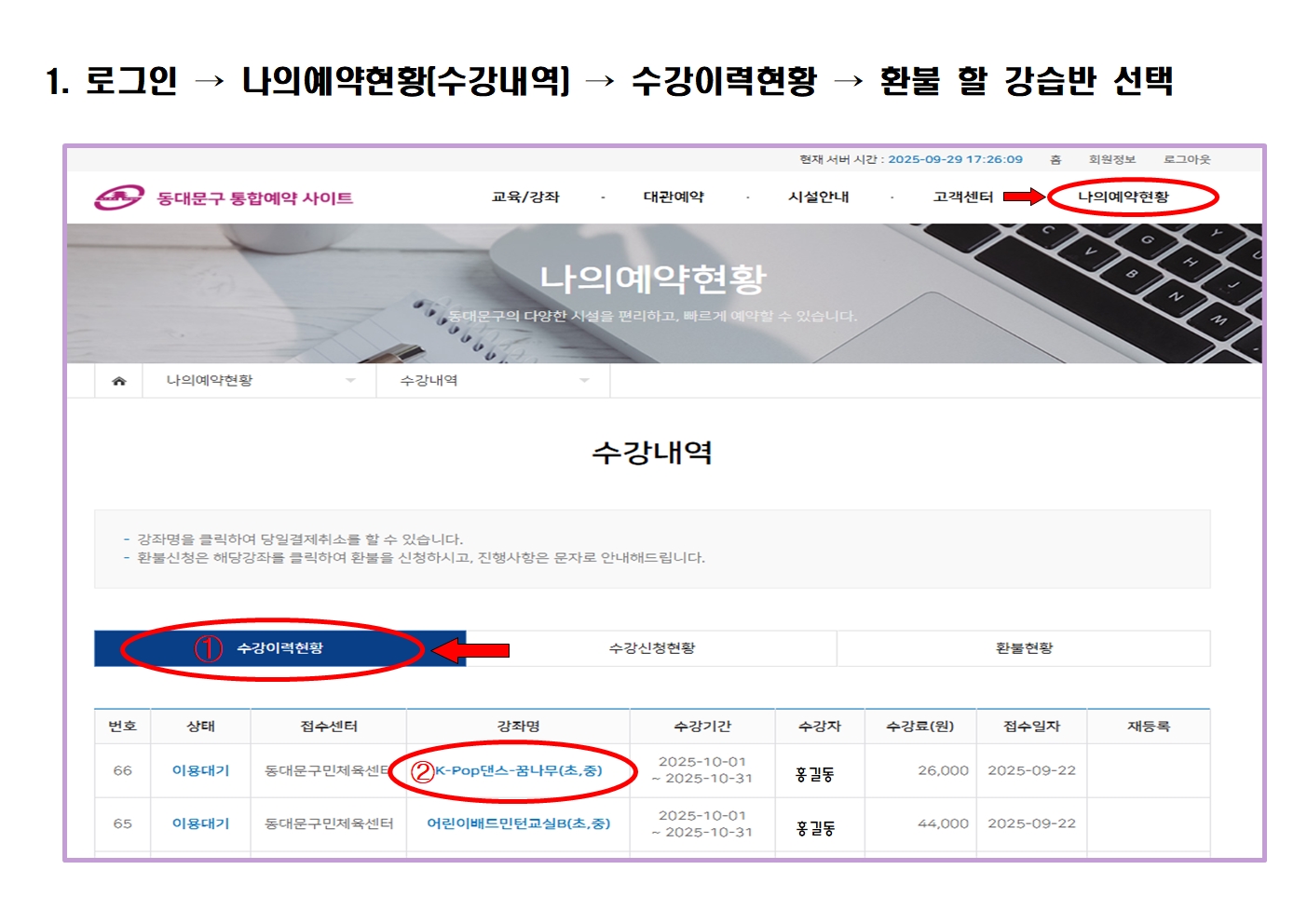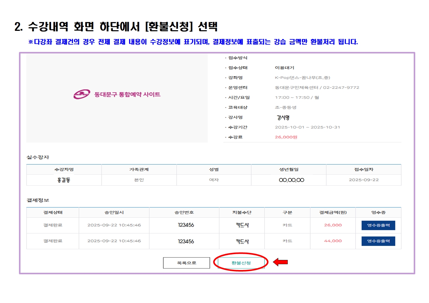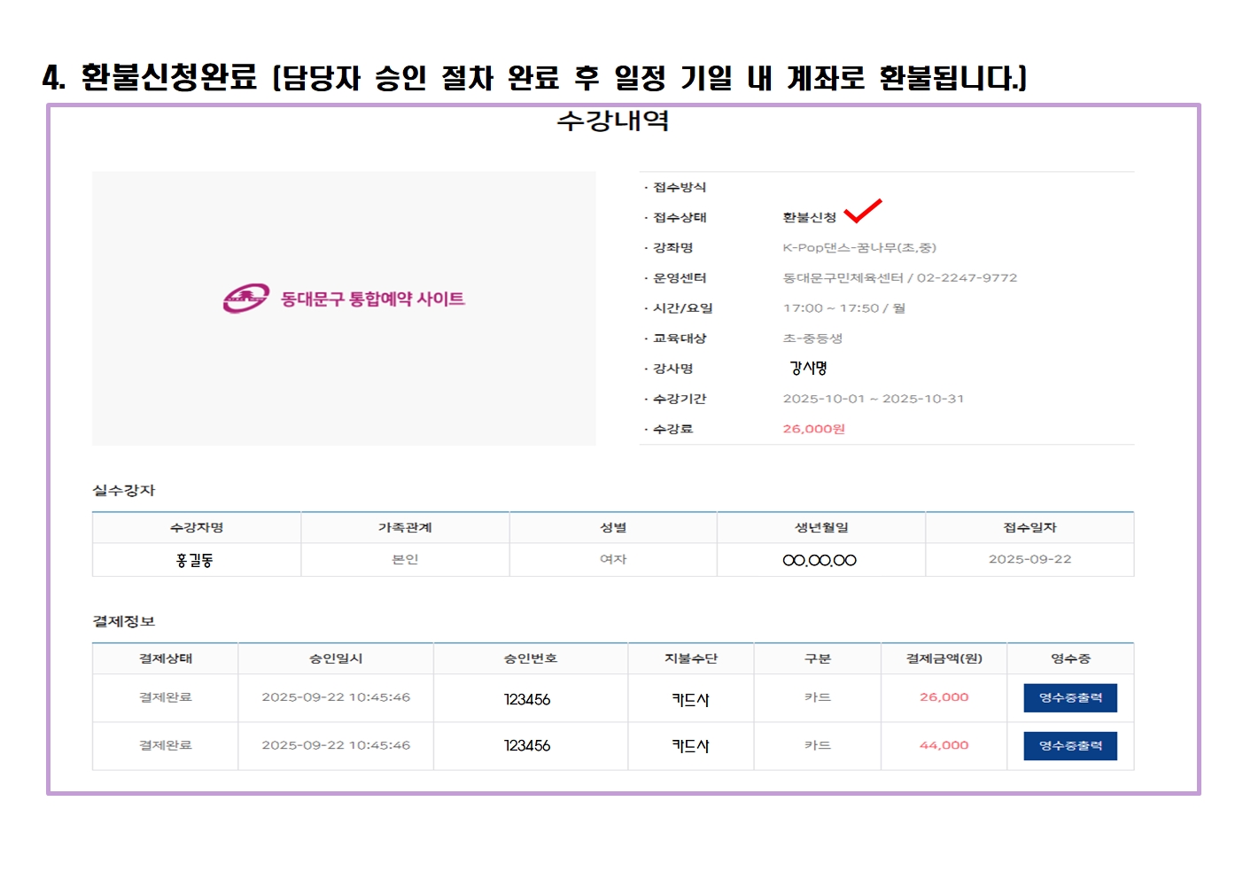 기타 온라인 환불 접수방법 안내 작성자 : 동대문관리자 조회 : 169 등록일시 : 2025년 9월 30일 17시 12분 34초 다강좌 인터넷 환불 방법1.jpg [ Size : 405.13KB, Down : 30 ] 미리보기 다운로드 다강좌 인터넷 환불 방법2.jpg [ Size : 308.99KB, Down : 24 ] 미리보기 다운로드 다강좌 인터넷 환불 방법3.jpg [ Size : 364.83KB, Down : 29 ] 미리보기 다운로드 다강좌 인터넷 환불 방법4.jpg [ Size : 263.8KB, Down : 32 ] 미리보기 다운로드 ※ 해당 공지사항은 여러 강좌를 동시에 결제한 ‘다강좌 환불’에 대한 안내이며, 단일강좌 환불 시 환불처리 시점에 따라 카드취소 우선 처리 후 계좌환불 됨을 알려드립니다. 목록보기