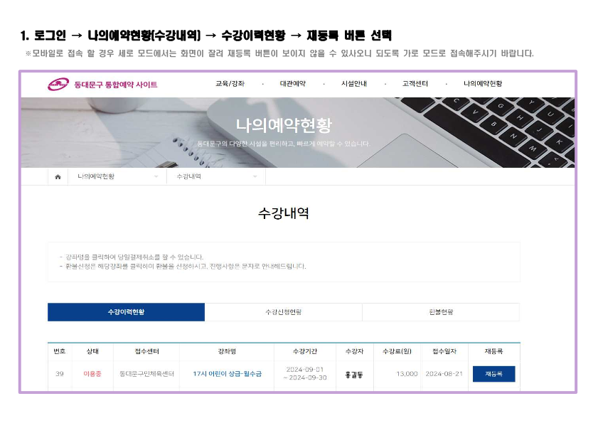 수강신청 온라인 재등록 방법 작성자 : 동대문관리자 조회 : 1,006 등록일시 : 2024년 9월 20일 18시 13분 27초 온라인 재등록 방법_1.png [ Size : 186.84KB, Down : 1,049 ] 미리보기 다운로드 온라인 재등록 방법_2.png [ Size : 82.36KB, Down : 981 ] 미리보기 다운로드 온라인 재등록 방법_3.png [ Size : 125.79KB, Down : 994 ] 미리보기 다운로드 목록보기