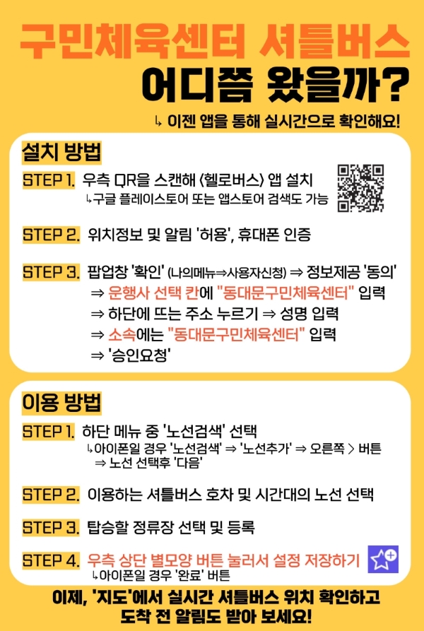 센터이용 셔틀버스 위치 확인 앱(헬로버스) 이용 안내 작성자 : 동대문관리자 조회 : 249 등록일시 : 2024년 8월 3일 10시 3분 39초 헬로버스 안내문.jpg [ Size : 299.93KB, Down : 215 ] 미리보기 다운로드 목록보기