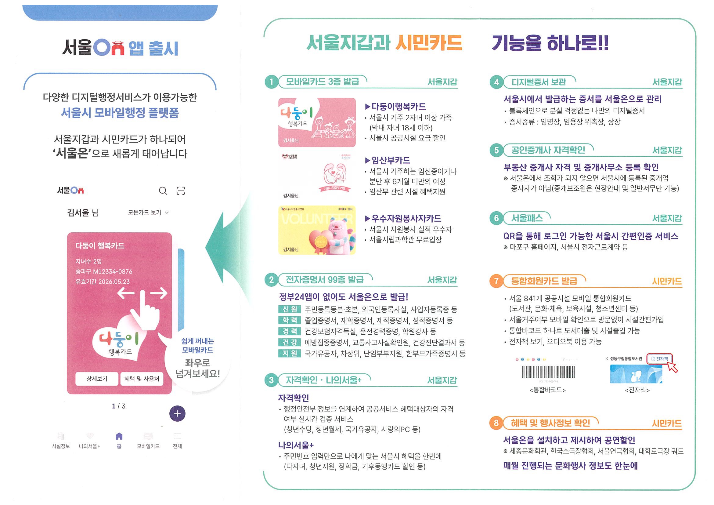 센터이용 서울온 앱 시설 간편가입(회원카드 대신 모바일로 이용 가능) 작성자 : 동대문관리자 조회 : 69 등록일시 : 2025년 12월 15일 17시 39분 0초 서울온3.jpeg [ Size : 549.54KB, Down : 15 ] 미리보기 다운로드 서울온4.jpeg [ Size : 548.65KB, Down : 17 ] 미리보기 다운로드 기존 서울시민카드 앱은 2025년 12월 까지 사용 후 종료 됩니다. 목록보기