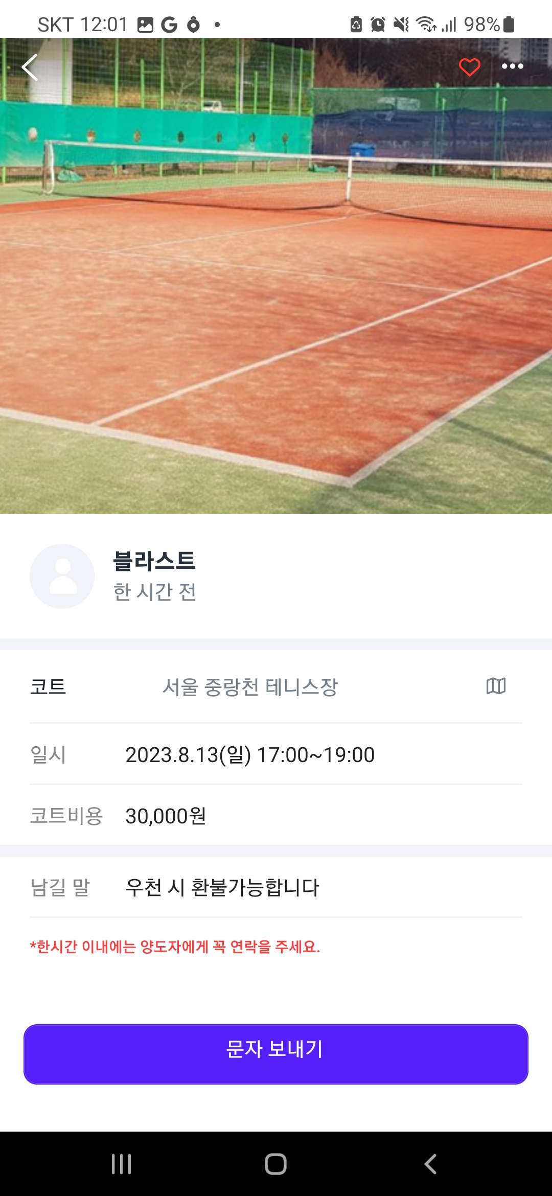 기타 코트 장사하시는분이 있습니다. 작성자 : 곽** 조회 : 448 등록일시 : 2023년 8월 5일 12시 10분 9초 Screenshot_20230805_120142_Messages.jpg [ Size : 305.63KB, Down : 156 ] 미리보기 다운로드 Screenshot_20230805_120154.jpg [ Size : 637.72KB, Down : 137 ] 미리보기 다운로드 중랑천테니스장은 주말공휴일 2시간에 8천원대인데양도 게시판에 3만원에 올리고 장사를 하시네요 .이렇게 되팔이하는 뷴들는 코트 예약 금지시켜야하는거아닌가요! 목록보기