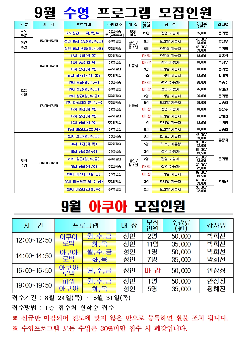 2023년 10월 수영 신규모집 잔여인원을 반변경 종료 후 업로드 예정이며, 아래 번호로 연락주시면