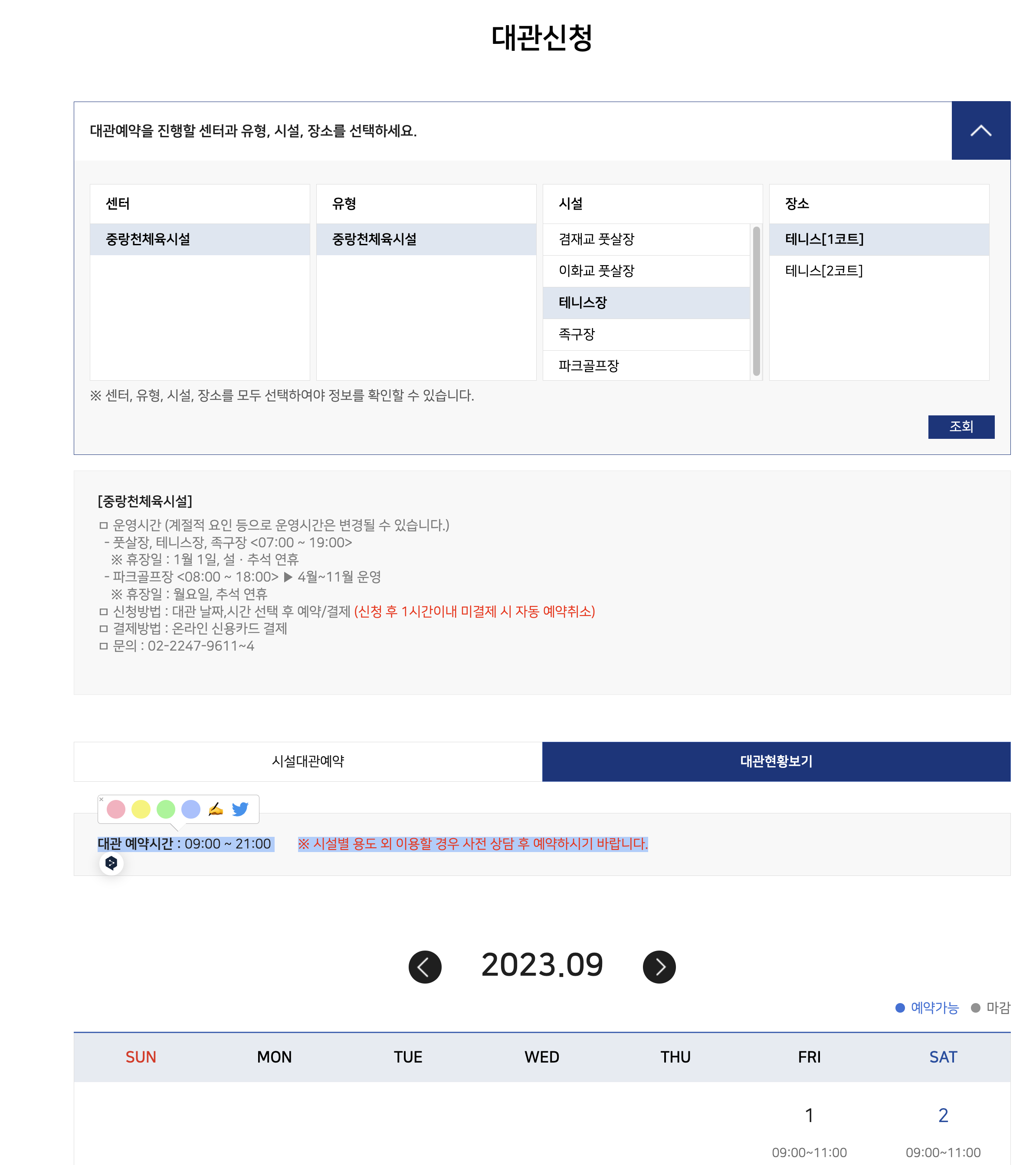 안녕하세요, 중랑천 테니스장 예약 가능시간은 첨부파일과 같이 21시까지로 되어있는데 예약이 가능한 시간은 19시까지로 표시되어서 문의드립니다.